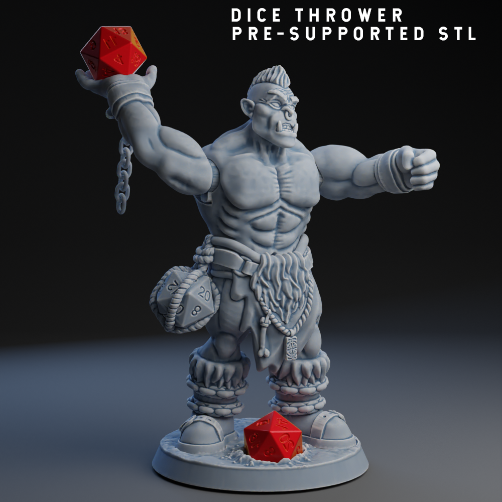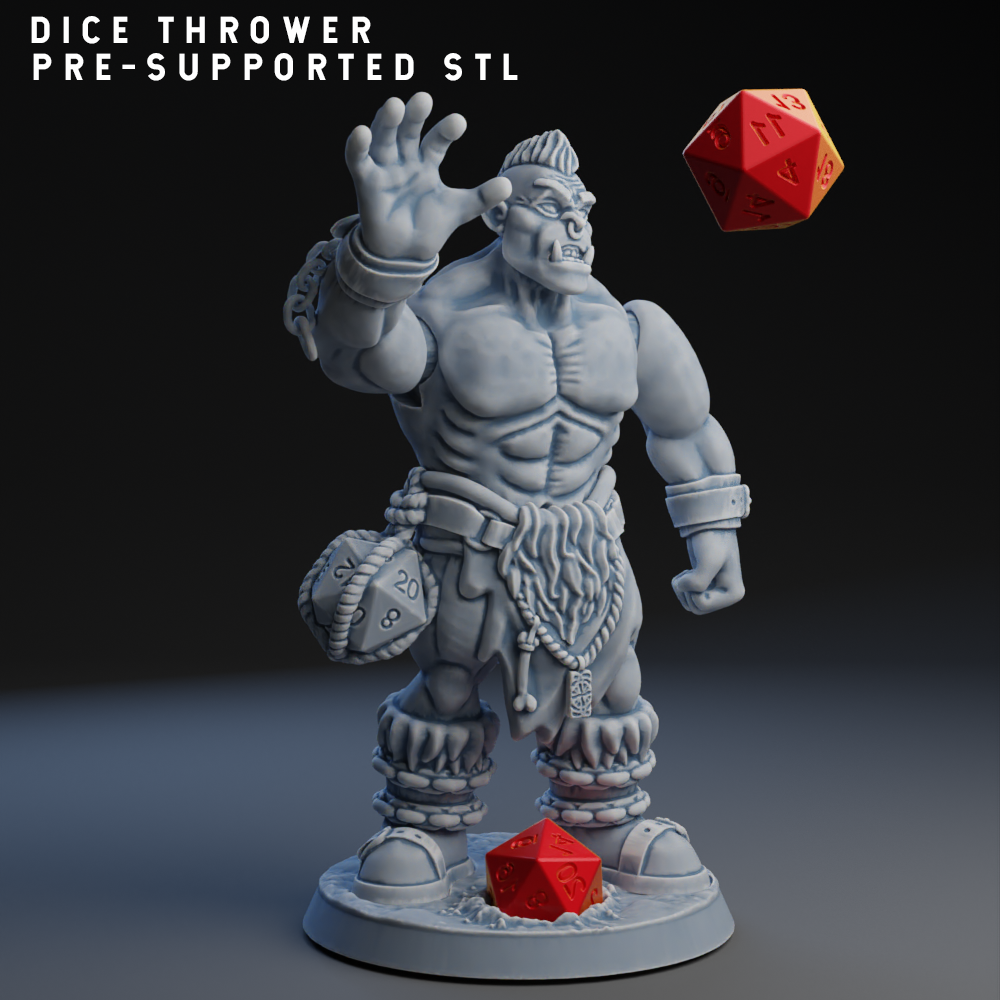 Dice Thrower is a Dynamic Large Miniature (50mm base/2” Base), By pressing on the left arm, the right one will move, throwing the dice, The chain on the right arm is also dynamic. Each link of the chain is disconnected from the others to make it movable.
